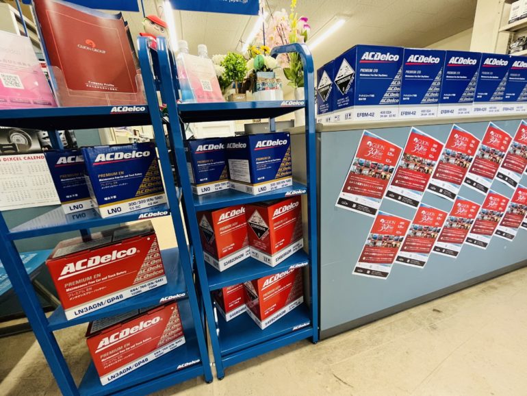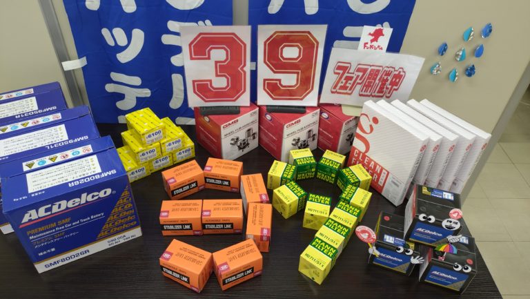 39Fair A4ポップと39 Fair注力商材のACデルコバッテリーを正面カウンターにドドドンッ!と並べ 玄関開けたら39Fair!!