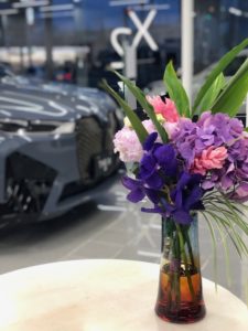 紫陽花で季節感を取り入れつつ、鮮やかなカラーでまとめることでショールームが明るくなるように工夫しました。