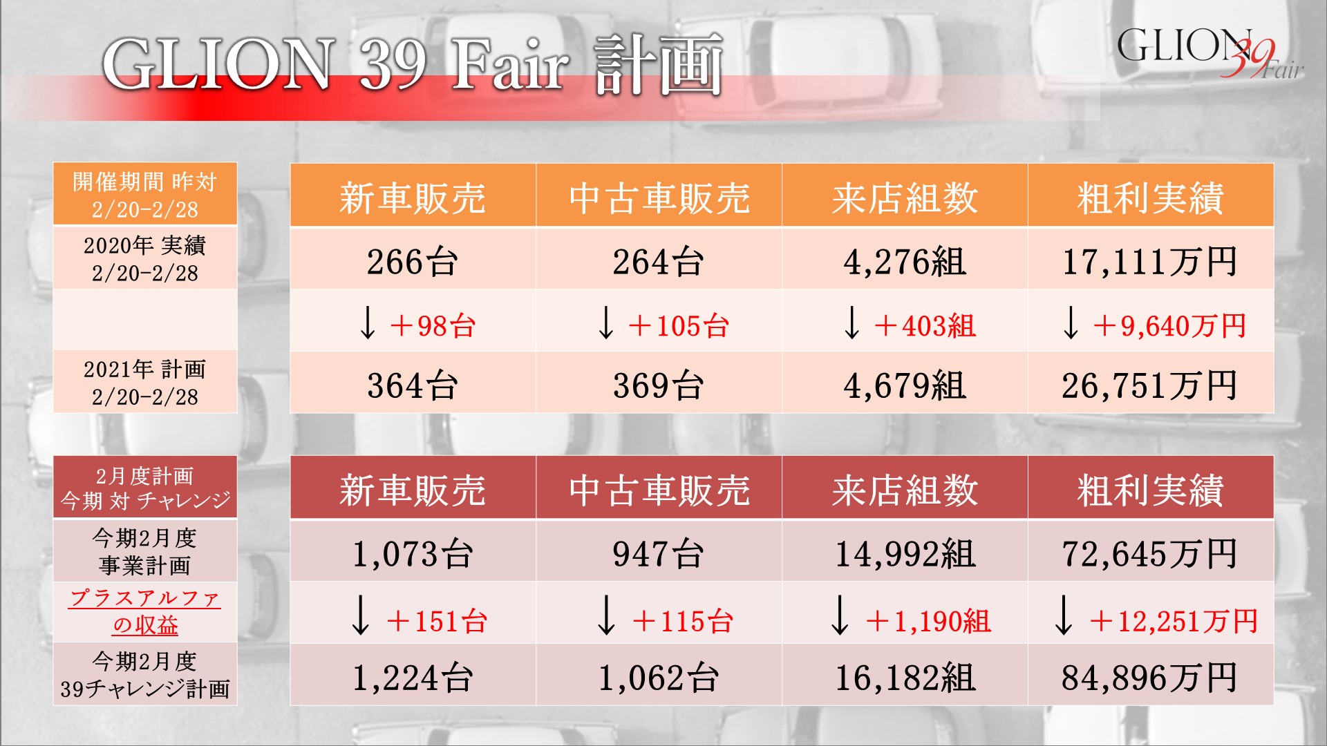 最後に、GLION 39 Fair開催による2月の粗利計画は8億4,896万円となっております。当初の2月計画から+1億2,251万円となっており、年度末最後の追い上げとなります。グループ一丸となってRevenG39計画達成への追い風として参りましょう!