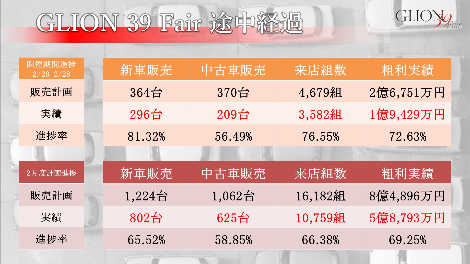 GLION 39 Fairが開幕して本日で7日目。残すは本日と週末の2日間の計3日間となりました。期間内での計画に対し既に70%を達成している本イベントの細かな実績速報を大公開!2月チャレンジ計画に対して、実績を積み上げるには付帯商品の提案・販売が必須です。+αの粗利を積み上げていく為にも今一度、ご確認をお願いします。