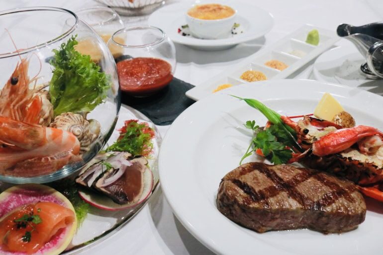 コース内容*AKARENGA特製チーズブレッド*シーフードプレート*オックステールのグラタンスープ*ステーキの王様サーロインとカナダ産活オマール海老*チェリージュビレ*コーヒーまたは神戸紅茶