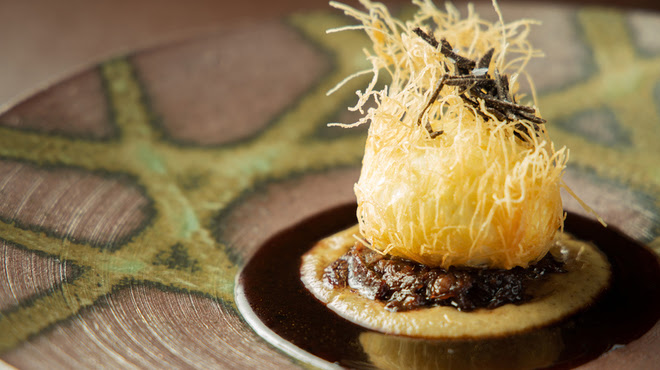 (赤ワイン煮込みをほぐしたもの)トリュフサブレにカダイフを纏わせました。