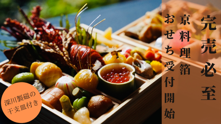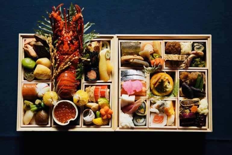 イクラ醤油漬け,甘鯛西京焼き,田作り,紅鮭昆布巻,蕨烏賊,数の子,海人参,海老芋旨煮,