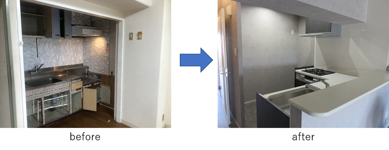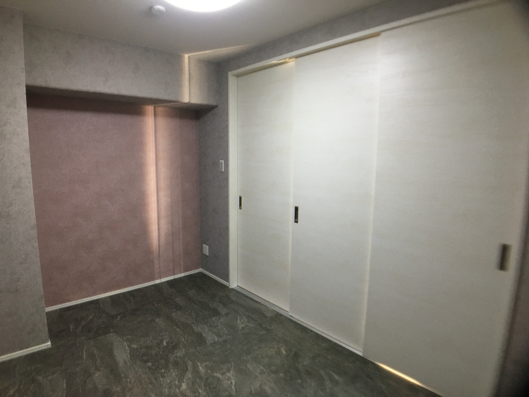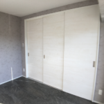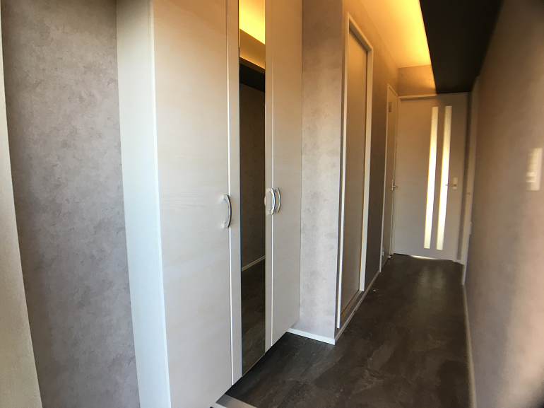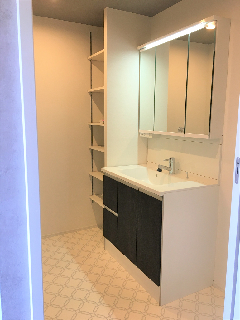 ジーライヤ不動産のリフォームの一番のこだわりは「収納スペース」を多く確保することです。今回も各部屋にクローゼットを設置し、リビングにもキッチンの横にパントリーとしても利用可能な可動式の棚仕様の収納スペースを設置しました。