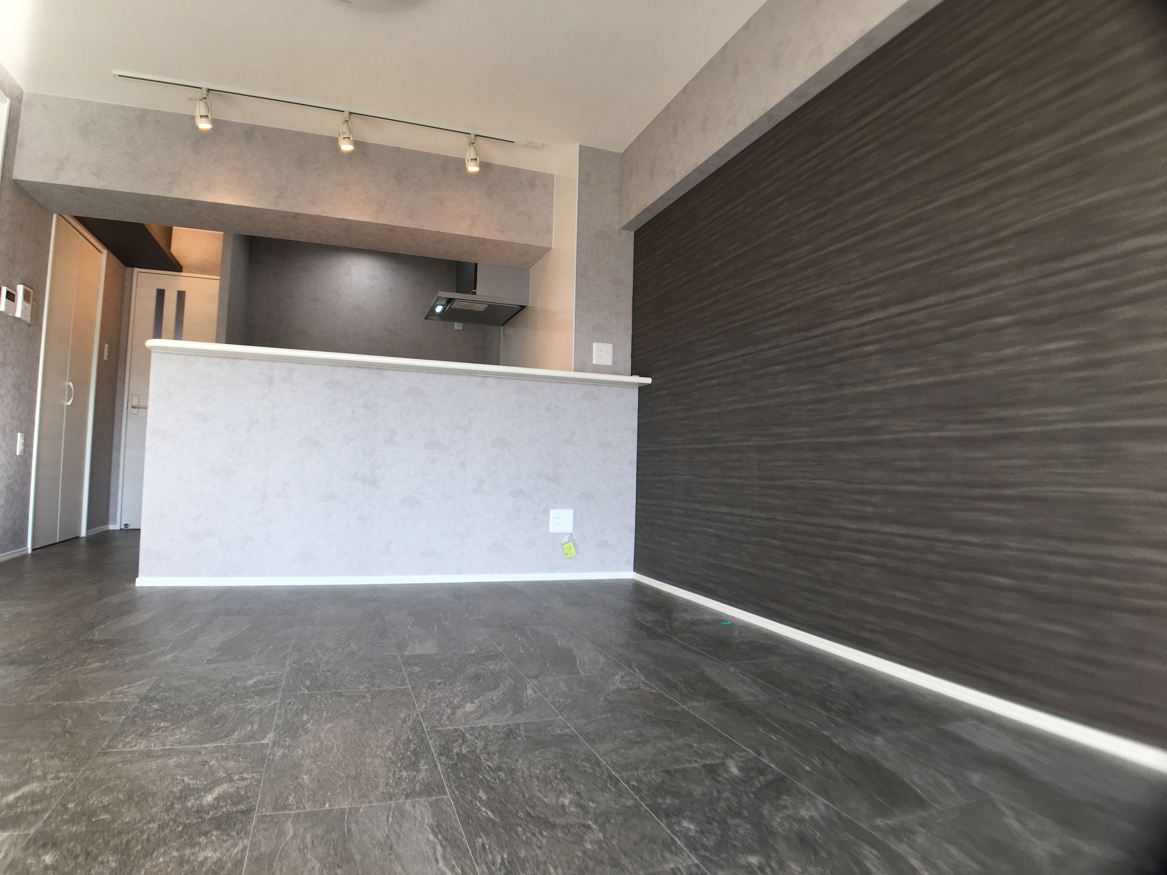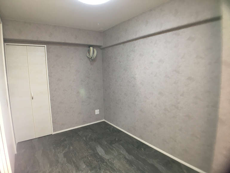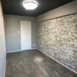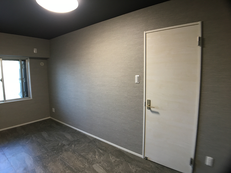 ●床材は少し濃い目のグレーのフロアタイル。室内ドアなどの建具は白で統一。壁紙も真っ白ではなく、床の色にあわせた薄いグレーのシックな色合いに。