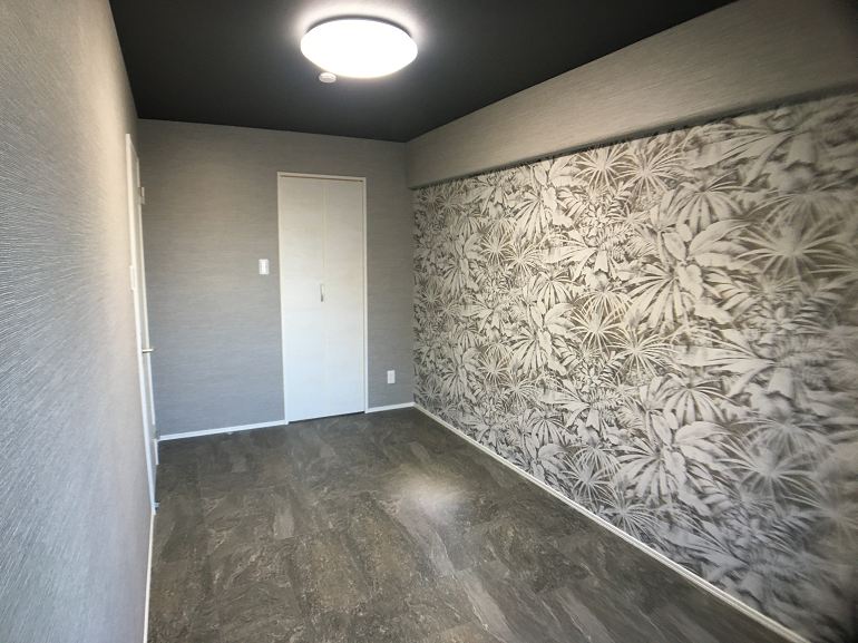 ●洋室①の※アクセントクロスは、一見大胆な柄ですが、実際にはホテルのような落ち着いた雰囲気。