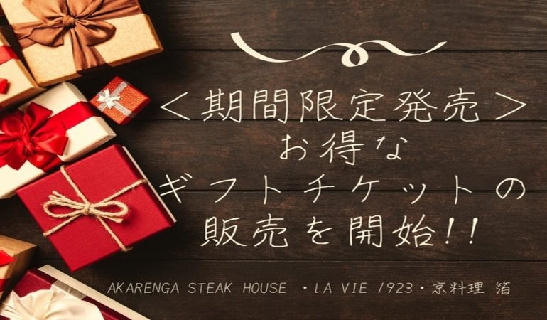 AKARENGA STEAK HOUSE、LA VIE 1923、京料理 箔の3店舗でご利用いただける10,000円のギフトチケットを期間限定でお得にご購入いただけます!