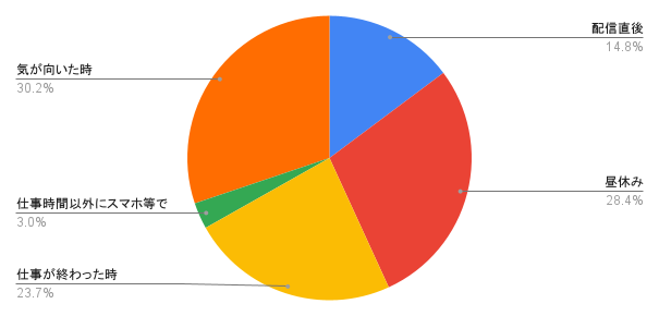 ナレッジを読むタイミングに関して、「気が向いた時」が前回に比べ約5%減少の30.2%でした。「配信直後」や「昼休み」、「仕事が終わった時」という回答も66.7%と過半数という結果のため、今後も引き続きお昼休憩のタイミングを目途とし配信出来るよう心掛け、社員の皆様により良い情報をお届けできるよう努めてまいります。