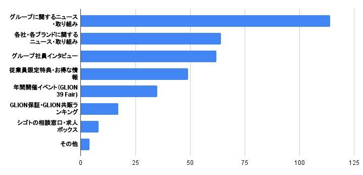 前回のアンケートでは、「印象に残っている記事」について回答いただいておりましたが、今回のアンケートではより社員の皆様がどういったカテゴリーの記事を読み印象に残っているのかを調査するため、「印象に残っている記事カテゴリー」と少し質問内容を変更しておりました。今回、質問内容を変更したことにより、グループだけでなく、各社・各ブランドに関する「ニュースや取り組み」が社員の皆様の印象に残っているため、引き続き皆様の求めている情報や店舗等で活用いただけるような情報を発信していきます。「社員インタビュー」や「従業員限定特典・お得な情報」を前年に比べ、配信数を増やしておりますので、是非ご覧ください!