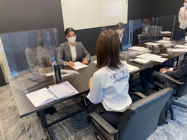 午前中は働く目的や社会人の心得、電話対応などのビジネスマナーを学び、午後からは実際BMW/MINI神戸ハーバー店のショールームで、それぞれの特徴や魅力を目で見て、触れて体感することができました。