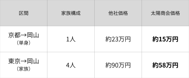 ※時期・荷物量により変動あり。上記価格はあくまでも例となります。春の異動期(2〜3月)は病院顧客などの依頼と重なるため、お早めのご相談が安心です!また、神戸市内などお近くの引っ越しも、他社より安価に対応できるケース多数。「まずは見積だけでも」というご相談も歓迎です!