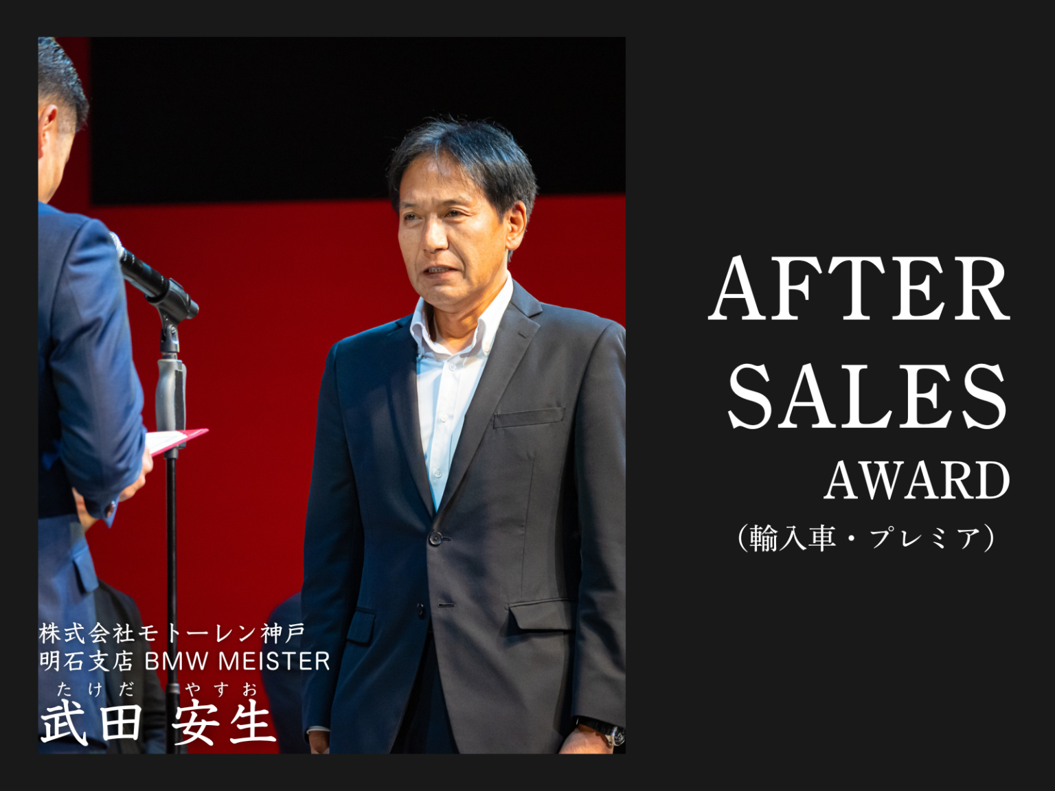 かつては「鬼の武田」として厳しさで知られましたが、今では温かさを兼ね備えた「仏の武田」として頼りがいのある存在に変貌を遂げました。若手メカニックからは「将来は武田さんのような仕事をしたい」と憧れの声が多く、その人柄と姿勢は組織の模範です。卓越した技術と指導力、そして人間性で広範囲の組織に貢献し絶大な信頼を集める武田さんは見事「AFTER SALES AWARD【輸入車・プレミア部門】」としてグランプリに選ばれました。