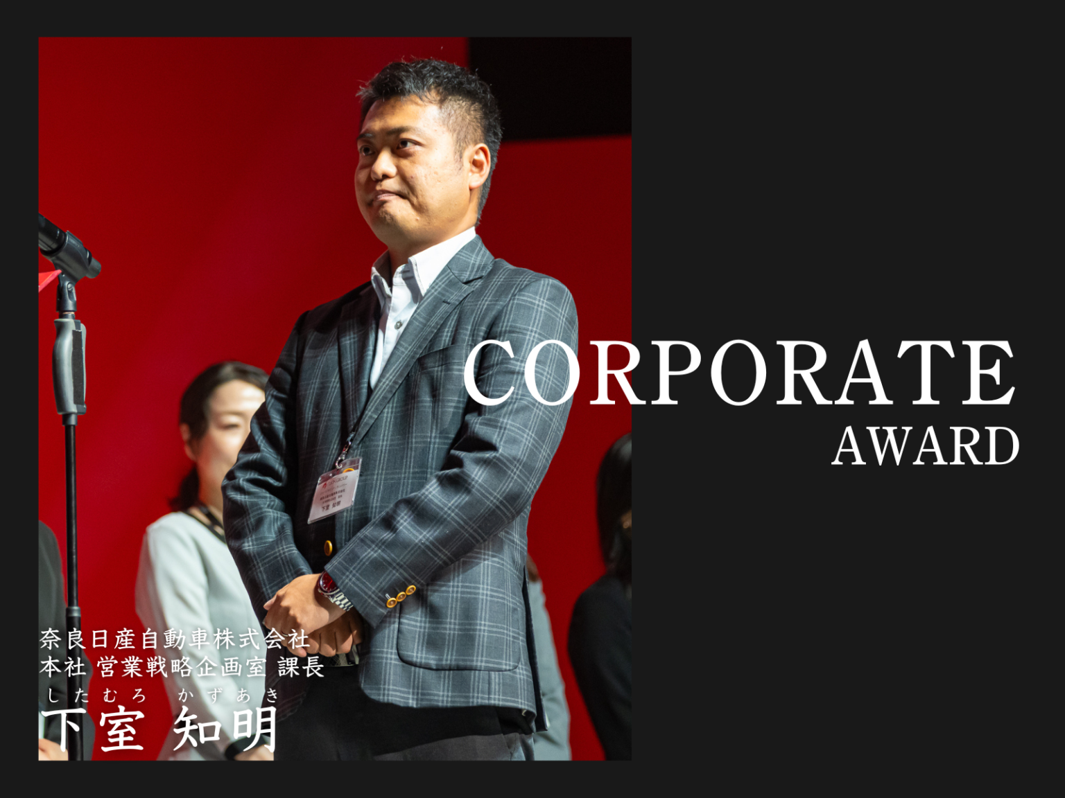 さらに、奈良日産のみならずグループの各種イベントにも積極的に参加される前向きな姿勢は周囲に良い影響を与え、他の社員の模範となっています。部門を横断した活躍により全社の成長を力強く牽引された下室さんは見事「CORPORATE AWARD」としてグランプリに選ばれました。
