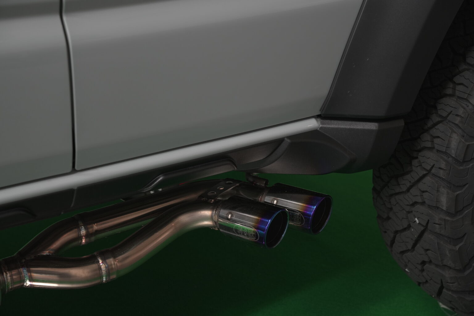 展示された車両にはその哲学が見事に反映されており、アウトドアシーンに馴染むタフさと、上質なラグジュアリー感が共存する特別な空間に仕上げられていました。さらにジムニーノマドには同じくGLION GROUPのカキモトレーシング株式会社の代表作「柿本改」のマフラーが装備されており、視覚的な美しさだけでなく、走りへの高揚感を期待させる本格的なカスタマイズが施されていました。