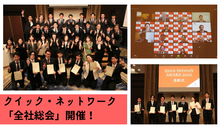クイック・ネットワーク株式会社が初となる全社総会を、オンラインとオフラインを掛け合わせて神戸メリケンパークオリエンタルホテルにて開催いたしました! 2021年度の功績を称える表彰だけではなく、中途・新入社員の紹介や202… -
